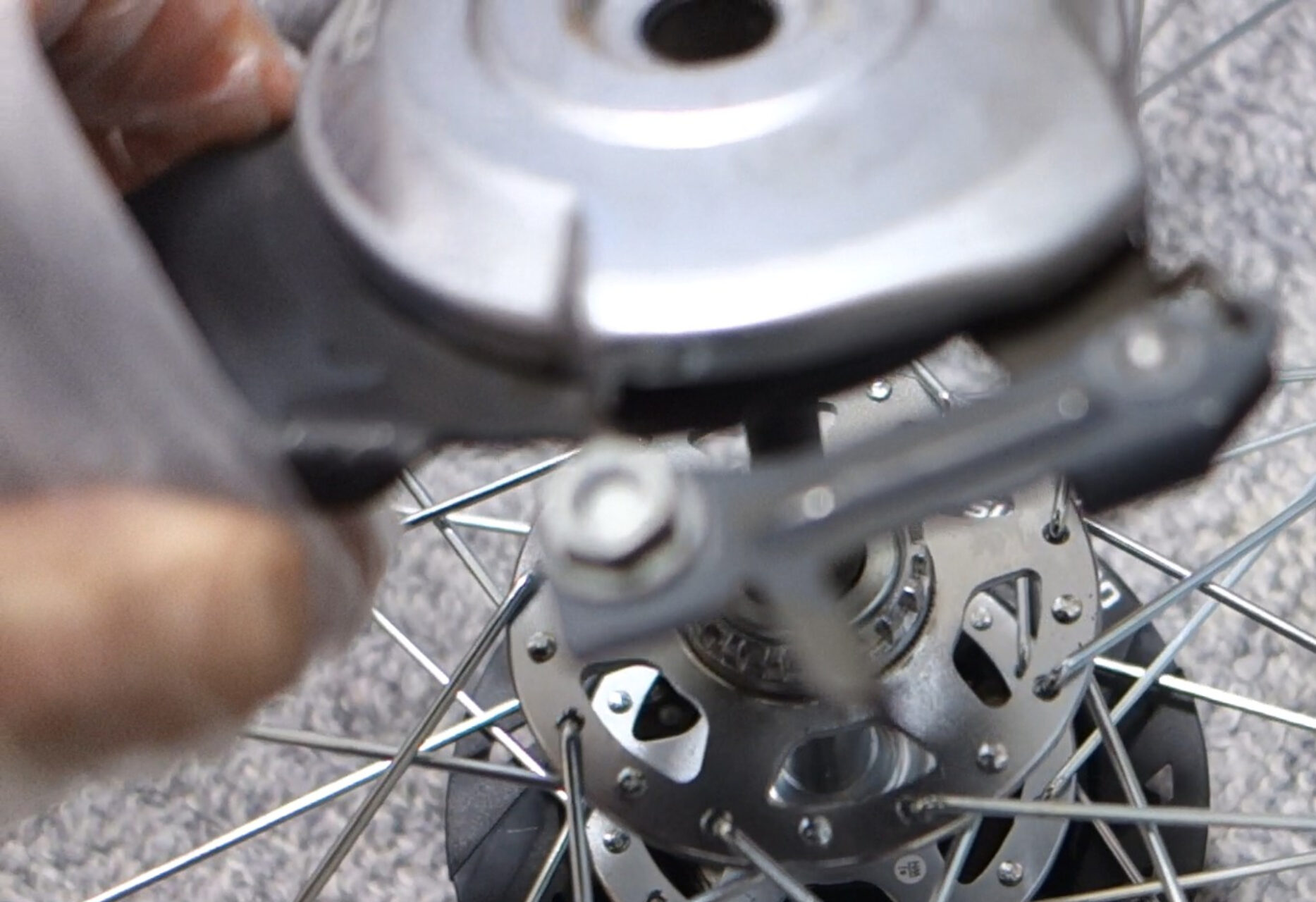 新車輪にブレーキを取り付けします。車軸のギザギザ部分がブレーキにかみ合うまではめ込んで苦労して外したナットを締めてあげるだけです。
