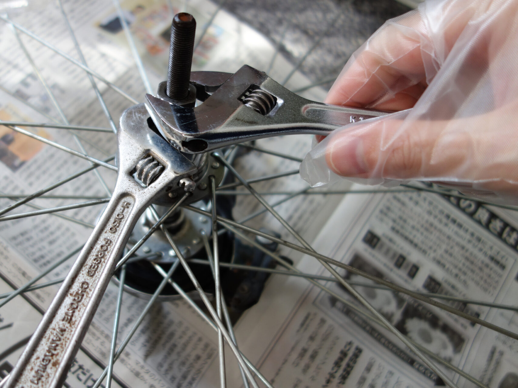 上のナットは真ん中の円筒形の部分が一体化している長ナットなので下の四角い薄い玉押しの部分が回らないように薄いスパナなどで押さえるのですが当方には無いのでモンキーレンチ2本で代用しました(長ナットの直径と玉押しの四角が同じくらいなので可能でした。シマノ製ハブは薄いスパナじゃないと無理みたい)。下のモンキーレンチは押さえて上のモンキーレンチを反時計周りに回します。