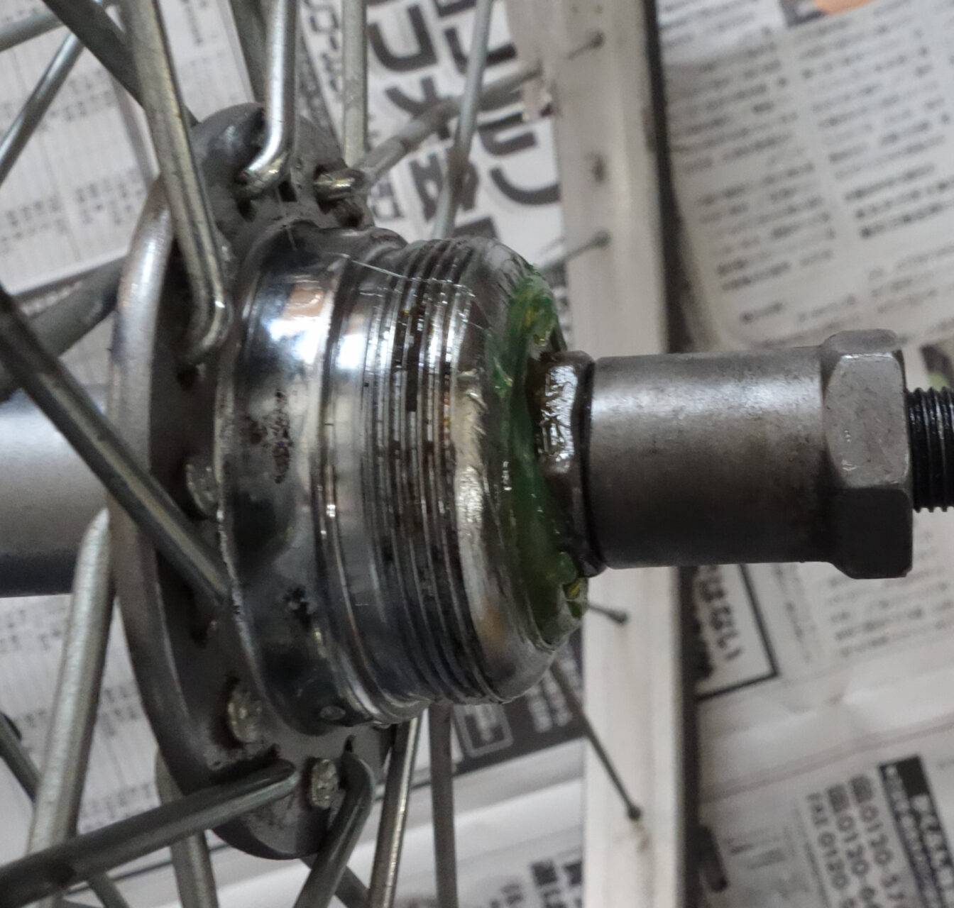 ハブやベアリングのグリスをブレーキクリーナーで掃除して新しいグリスを塗布し再度組み上げます。グリスは溢れ出る位で良いらしいのでドップリ塗って玉押しを締めたところそれなりに溢れました。防水にもなるのでこれで良いらしいです。