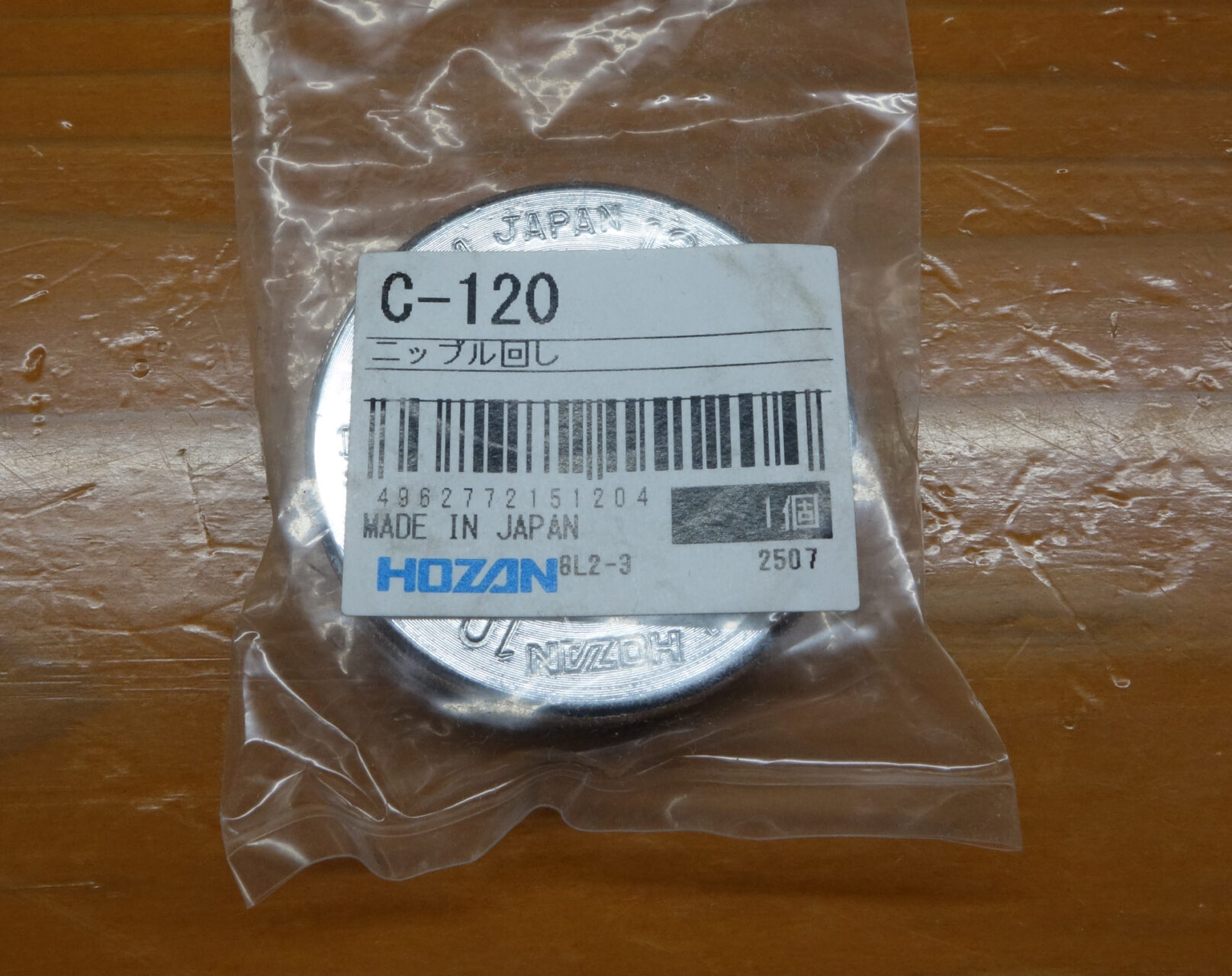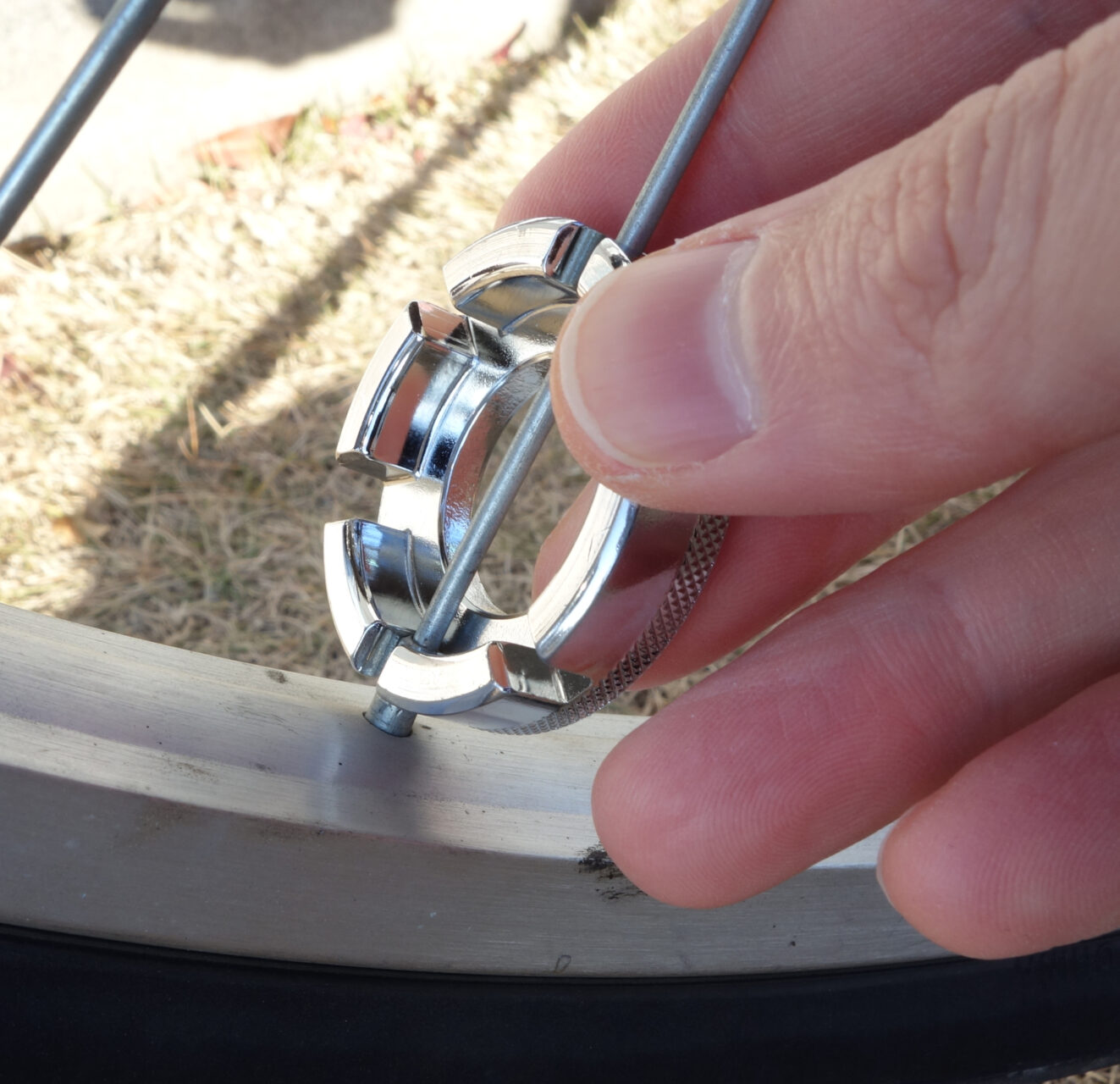 こちらをニップルにはめ込んで使用します。ニップルにはいくつかサイズがあるようですがホーザンのこのニップル回しで大抵のママチャリは対応できるようです。