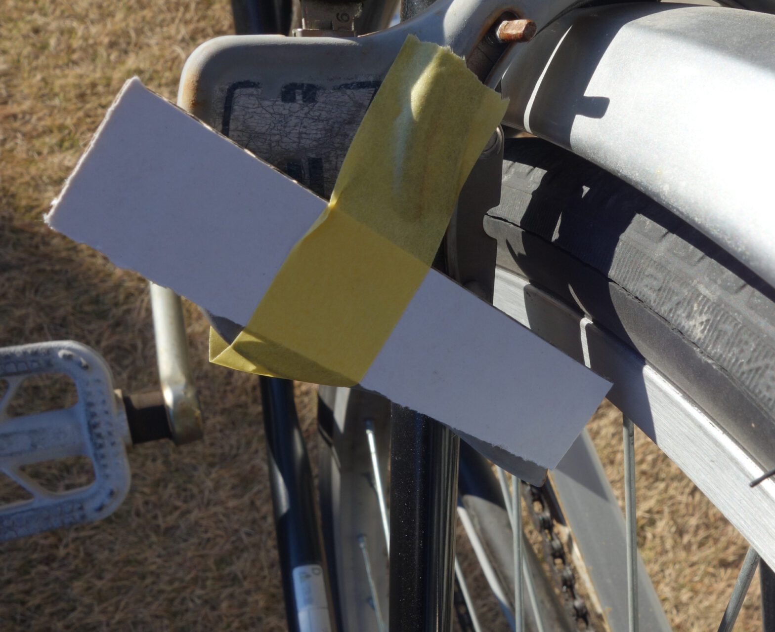 車輪のリム部分の横に段ボールの切れ端を張り付けて車輪を回転させたときのリムと段ボールの先の距離を見ます。狭ければ左によっていますし広ければ右によっています。どちらかによっている箇所がスポークの緩みか張りすぎのどちらかという事です。スポークをよく見ると分かるように斜めに引っ張られているからです。