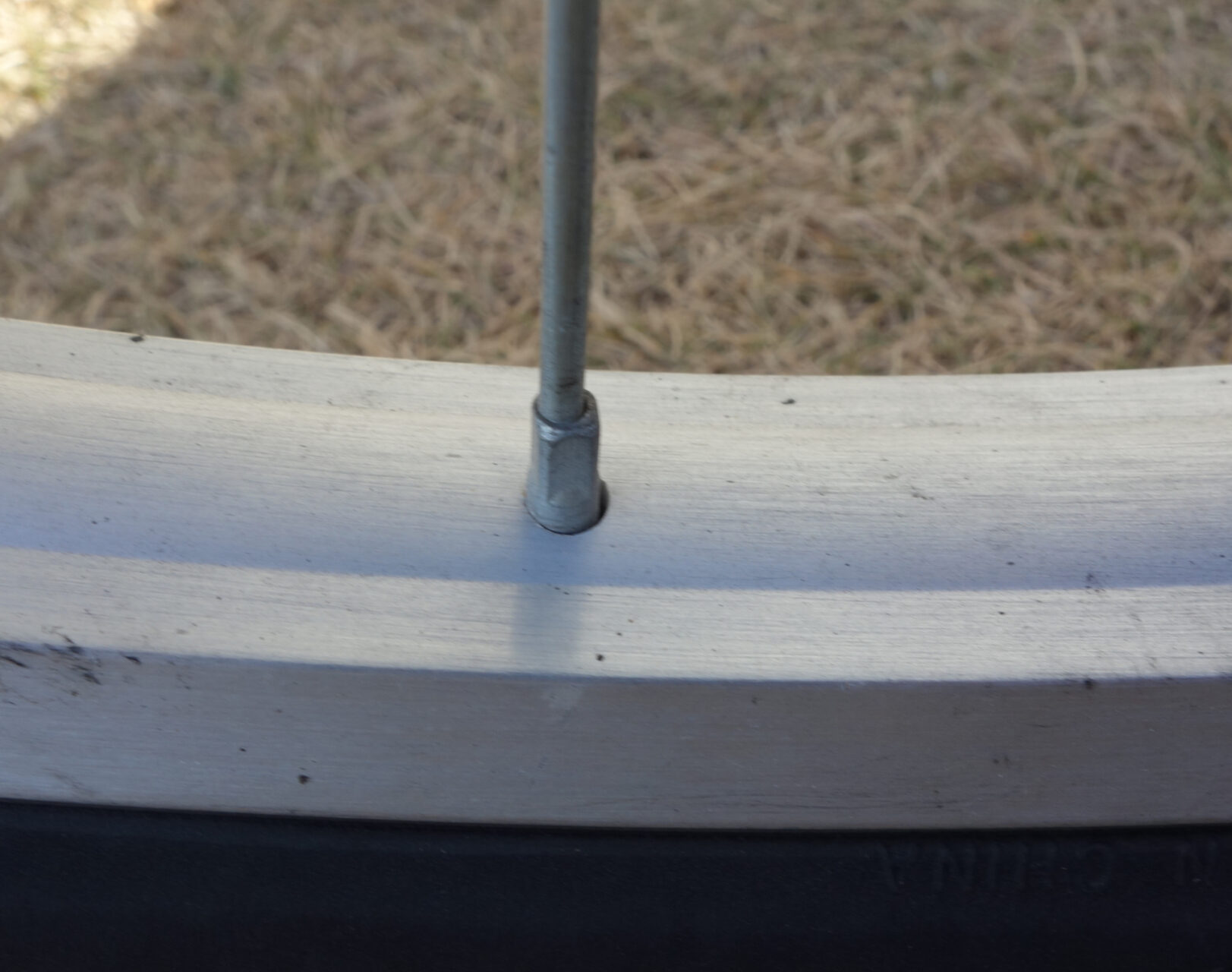 一点気になったのがニップル周りのリムに傷のような跡がほぼ全ての箇所についていたこと。ニップルもこじり跡のようなものが付いていたのでニップル回しでなく普通のペンチで回したのかなぁという気がします。自転車売り場の自転車数台のリムを見てみるとこういう傷は見当たらないので手抜きか製造担当のアルバイトさんの時給をケチったかな?