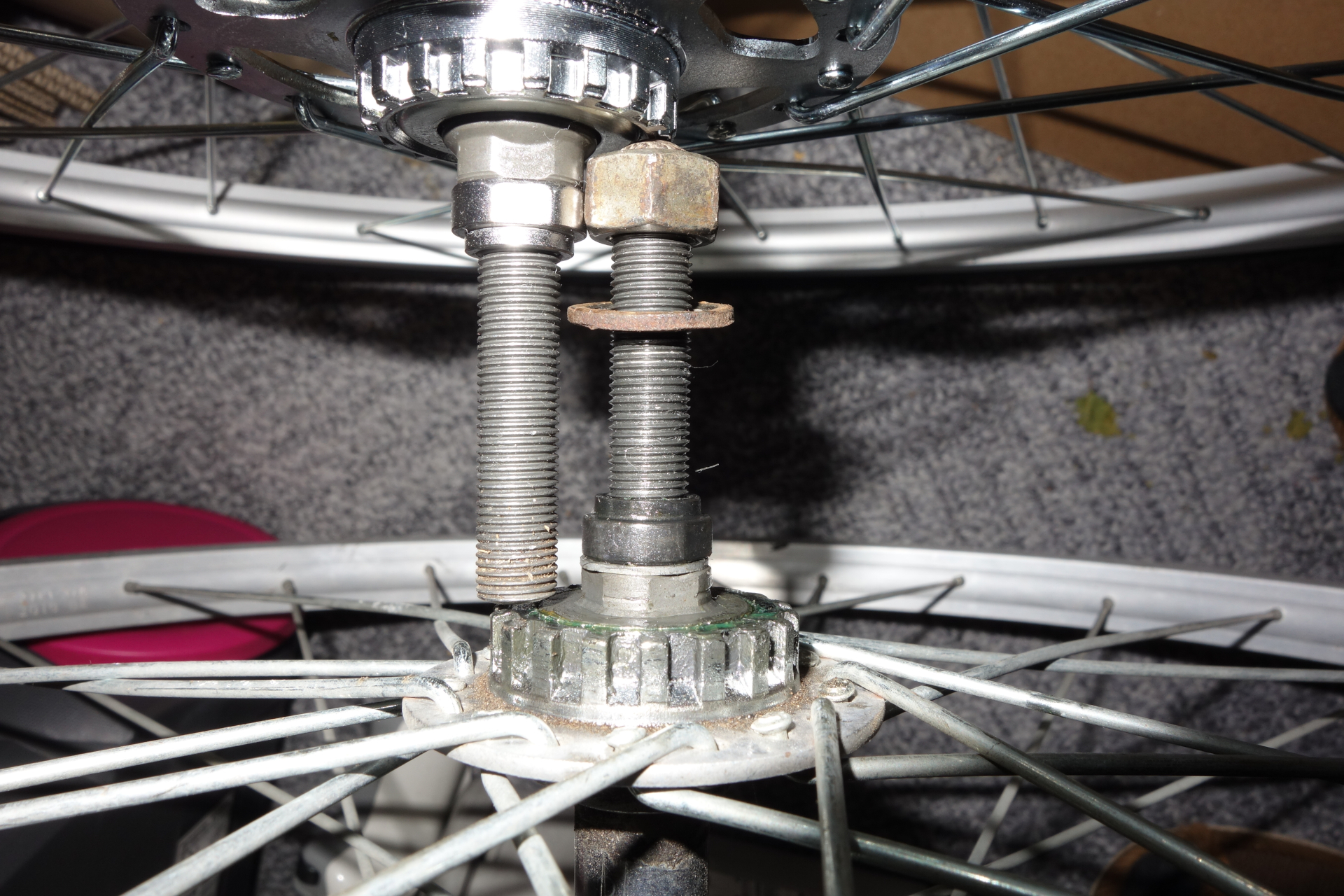 倉庫に自動車用のメガネレンチが有ったのでフリーホイール側をダブルナットにしてブレーキのナットを回します。メガネレンチだと少し窪みに入り込みナットを全周掴むので力が逃げないようです。