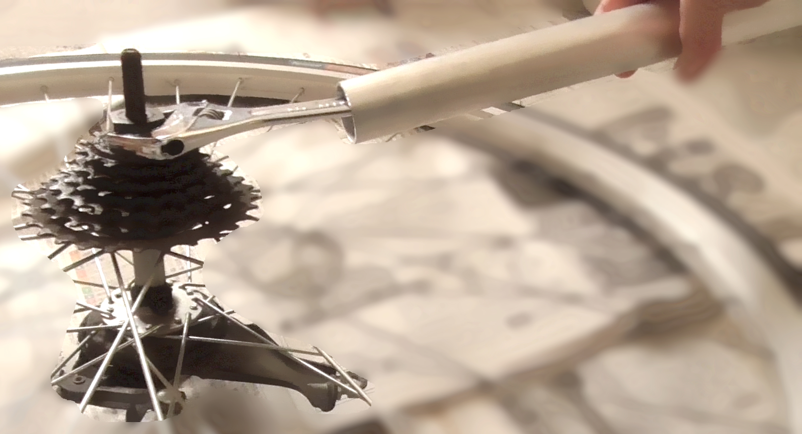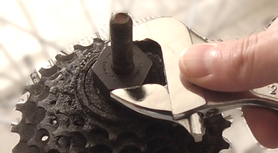 外した後輪のギヤ部分を外す為にシマノのTL-FW30というフリーホイールリムーバーを軸部分に差し込んでモンキーレンチで反時計周りに回します。